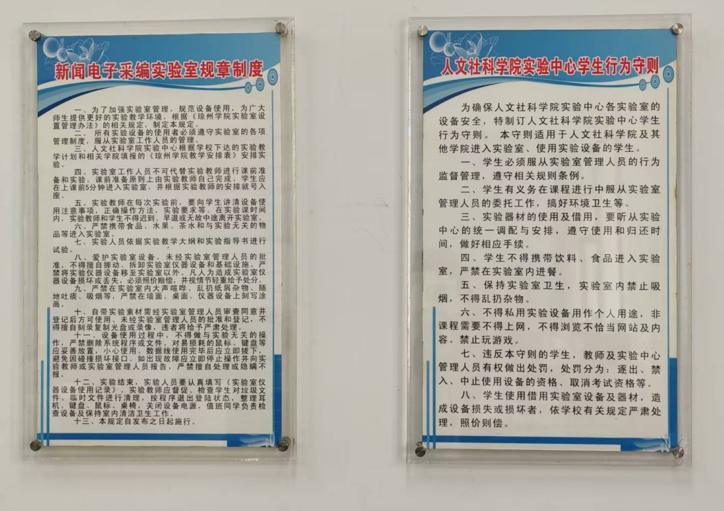 实验室是高校建设的基本保障,是教学水平、科研水平、服务水平最直观的体现。语言文字数媒化传承传播与创新研究实验教学中心在教学运行过程中,制度了方方面面的管理制度,并通过分散式和集中式管理,有效落实在实验室建设管理的全过程之中。通过集中式管理,针对整个实验中心制定了统一的实验室管理规定,具体包括:《实验中心管理制度》、《实验室安全管理制度》、《实验中心实验课程(指导)教师职责》、《实验室器材教学借用管理规定》、《实验中心学生行为守则》5个制度性文件。这些制度适用于bwin·必赢网址所有实验室,主要明确了整个实验中心的日常管理、安全管理、设备管理和人员职责等制度,以此实现整个实验中心正常运行的政策保障。另一方面,实验中心针对不同的、具体的实验室又实行了分散式管理制度,并制定了适用于各实验室的《实验技术人员岗位职责》、《实验指导教师职责》、《学生实验守则》、《仪器设备管理规定》、《仪器设备损坏赔偿制度》、《低值耐用品管理制度》等,确保各个实验室的运行有章可循。以上管理制度均已制度上墙。